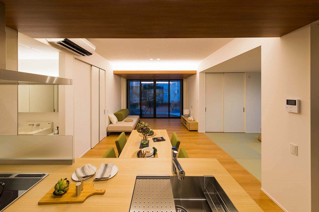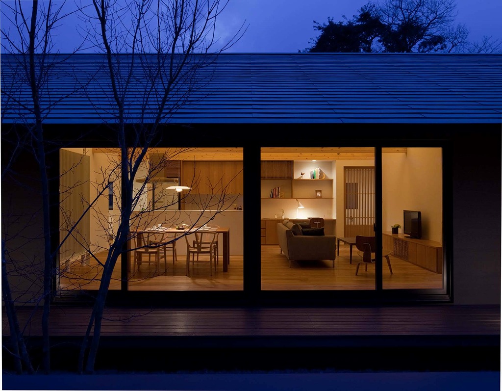 外観の美しさと居室に通じる長いウッドデッキが特徴の平屋です。とくに、リビング&ダイニングの大きな開口は、ウッドデッキを通して外の景色との一体感を生み出します。 中間領域を大事にしたことで生まれる自然との一体感は、住まう人に開放的な気分をもたらします。 朝、キッチンに立って、季節の移り変わりを感じられる。そんな贅沢が、暮らしをより豊かに彩ります。