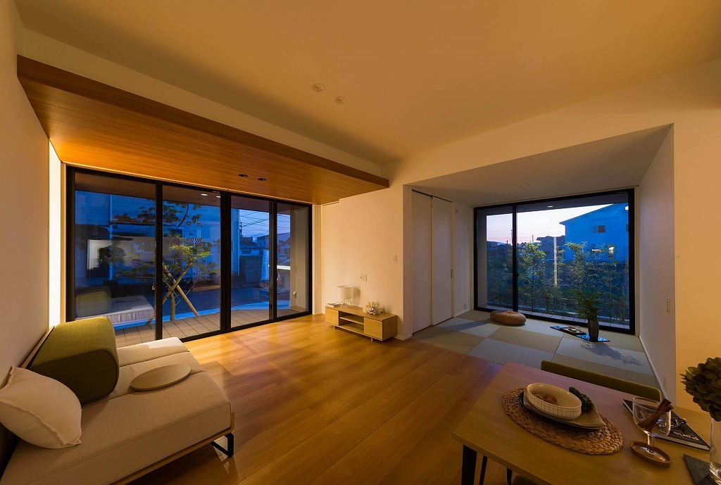 外観の美しさと居室に通じる長いウッドデッキが特徴の平屋です。とくに、リビング&ダイニングの大きな開口は、ウッドデッキを通して外の景色との一体感を生み出します。 中間領域を大事にしたことで生まれる自然との一体感は、住まう人に開放的な気分をもたらします。 朝、キッチンに立って、季節の移り変わりを感じられる。そんな贅沢が、暮らしをより豊かに彩ります。